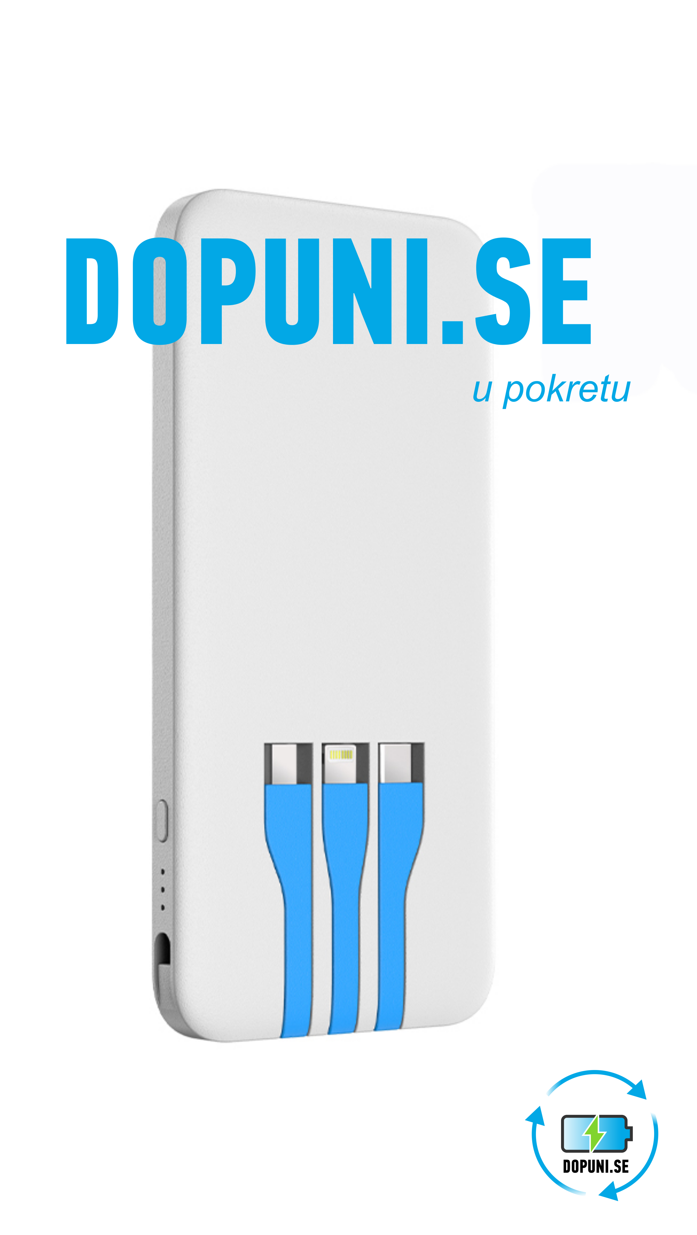 Bez obzira na to da li imaš Android ili Iphone, dopuni.se! Naše baterije imaju tri tipa integrisanih konektora sa kablom: type C, micro USB i lightning.